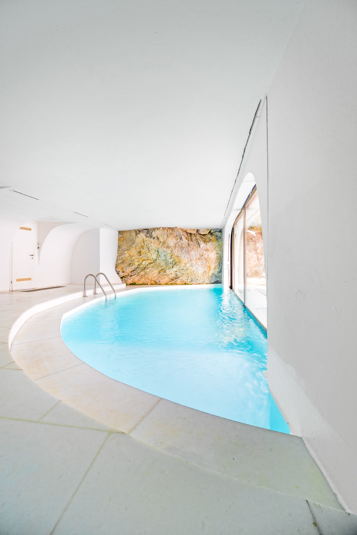 In 1972, it was extended by the Casa Radulff with which it forms a single complex today. The house is built on top of a rock which is integrated into the swimming pool area in the basement. The light and mood remind me a lot of Cesar Manrique's buildings on the Canary Islands.